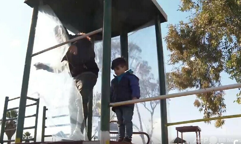 シリアのアレッポ地区では、地震発生後、多くの被災者が家を失っており、西側諸国による長期間の制裁で、地元政府もテントなどの救援物資が不足しているため、多くの被災者が避難できないままになっています。現地は夜間の気温が氷点下にまで下がり、被災者は屋外の避難所で夜を過ごさざるを得ません。被災者のシャハールさんは子どもが寒さで病気になるのを心配しながらも、できることは、子供が夜寝る時に寒風をさえぎることができるよう、ナイロン製のロープやビニールシートを集めて、避難所にある児童遊園の施設の鉄柱にくくりつけ、粗末なテントを作ることだけです。(c)CGTN Japanese/AFPBB News