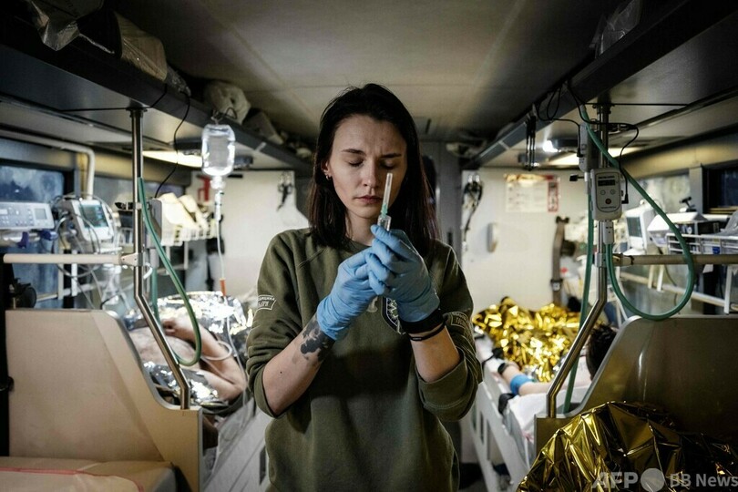 【2月12日 AFP】ロシアによる侵攻が続く中、ウクライナのドネツク(Donetsk)州に停車する、医療救助バス。負傷したウクライナ兵の搬送を支援するボランティア団体「ホスピタラーズ(Hospitallers)」が運行している。