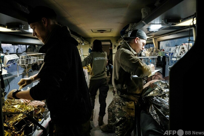 【2月12日 AFP】ロシアによる侵攻が続く中、ウクライナのドネツク(Donetsk)州に停車する、医療救助バス。負傷したウクライナ兵の搬送を支援するボランティア団体「ホスピタラーズ(Hospitallers)」が運行している。