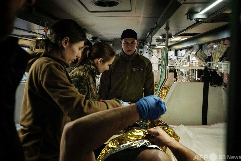 【2月12日 AFP】ロシアによる侵攻が続く中、ウクライナのドネツク(Donetsk)州に停車する、医療救助バス。負傷したウクライナ兵の搬送を支援するボランティア団体「ホスピタラーズ(Hospitallers)」が運行している。