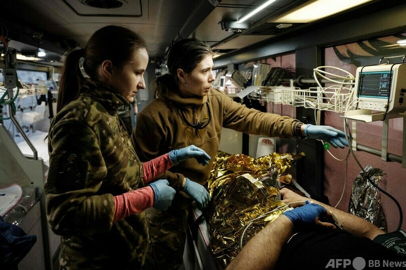 【2月12日 AFP】ロシアによる侵攻が続く中、ウクライナのドネツク(Donetsk)州に停車する、医療救助バス。負傷したウクライナ兵の搬送を支援するボランティア団体「ホスピタラーズ(Hospitallers)」が運行している。