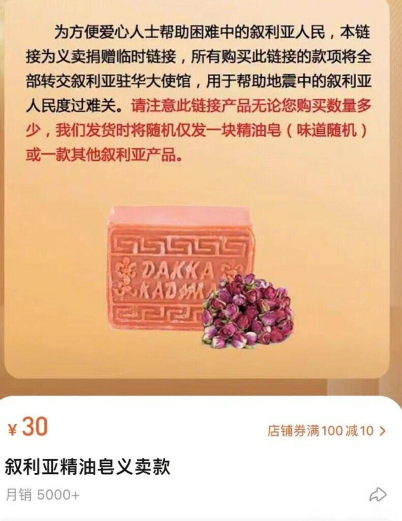 石けんは販売開始からわずか1時間で1000個以上も売れ、タオバオとJDドットコムの売れ筋商品ランキングに入りました。注文が殺到し出荷が追いつかず、売主がおわびをするほどです。商品掲載ページのコメント欄には、「発送は不要です。微力ですが、シリアの人々の役に立てれば幸いです」「私は四川人で、地震による苦難を経験しました。シリアの人々の困難さがよく分かるので何かしたいと思いました。『あなたたちは孤独ではない』と伝えたくて…」「自分も雨に濡れたことがあるので、傘を差してあげたい。シリアの人々が一日も早く難関を乗り越えられるよう願っています」などの書き込みがありました。