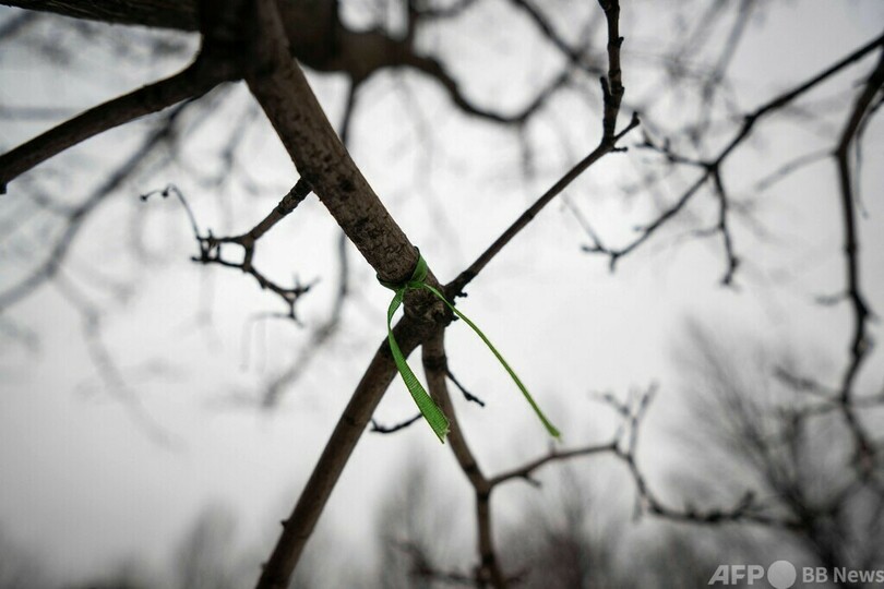 木の枝やフェンス、街灯に結び付けられた緑のリボン。緑はウクライナ国旗の青色と黄色を混ぜた色を示しており、平和を願う隠れたメッセージとなっている。(c)AFP