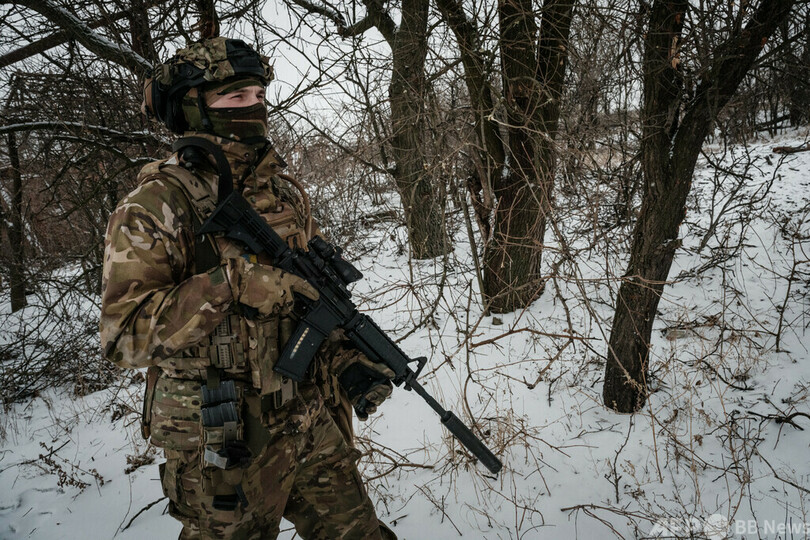 【2月23日 AFP】ウクライナ東部の前線に近い町の外れで兵士がひざまずき、高性能ライフルの引き金に指を掛けている。