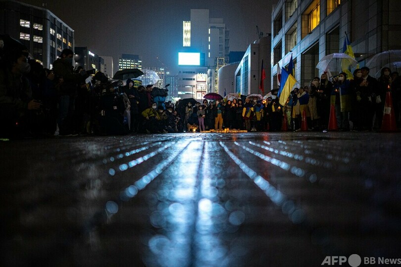 NGO「スタンド・ウィズ・ウクライナ・ジャパン(Stand With Ukraine in Japan)」が主催し、参加者は犠牲者を追悼するとともに、戦い続けているウクライナ国民に連帯を示した。(c)AFP