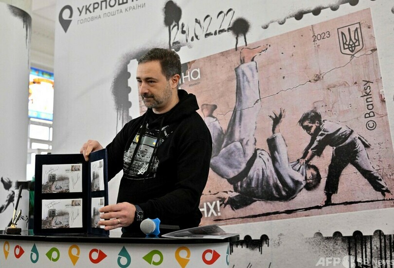 【2月25日 AFP】ロシアによる侵攻開始から1年を迎えたウクライナで24日、英国の覆面ストリートアーティスト、バンクシー(Banksy)が手掛けた、柔道で大人を投げる少年の壁画をモチーフにした切手が発売された。キーウ中心部にある中央郵便局には、買い求める人々が列をつくった。