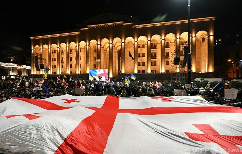 【2月25日 AFP】ジョージアの首都トビリシの議会前で、ロシアのウクライナ侵攻開始から1年となる24日、ウクライナに連帯を示し、ジョージアの欧州連合(EU)加盟を支持するデモが行われ、AFP記者の推計で約3万人が参加した。