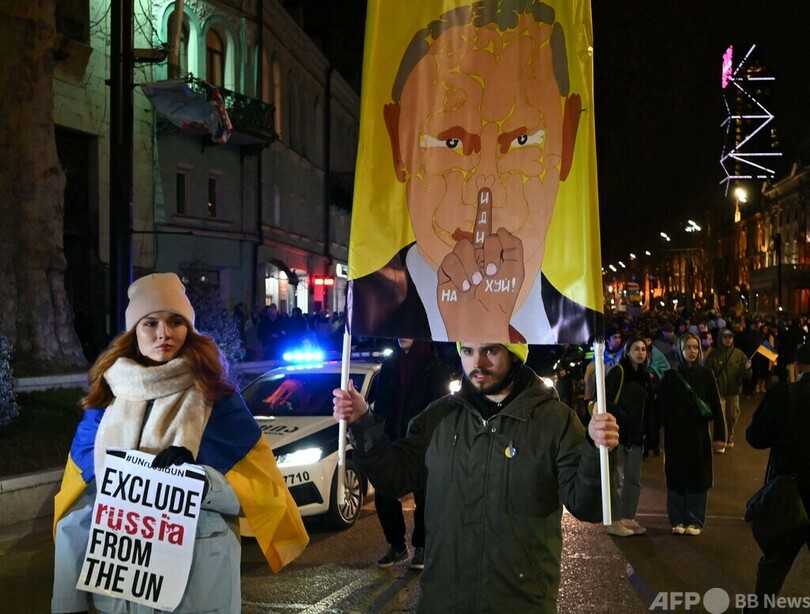 【2月25日 AFP】ジョージアの首都トビリシの議会前で、ロシアのウクライナ侵攻開始から1年となる24日、ウクライナに連帯を示し、ジョージアの欧州連合(EU)加盟を支持するデモが行われ、AFP記者の推計で約3万人が参加した。