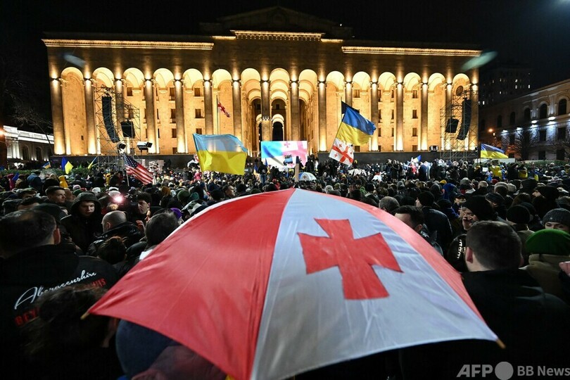 【2月25日 AFP】ジョージアの首都トビリシの議会前で、ロシアのウクライナ侵攻開始から1年となる24日、ウクライナに連帯を示し、ジョージアの欧州連合(EU)加盟を支持するデモが行われ、AFP記者の推計で約3万人が参加した。