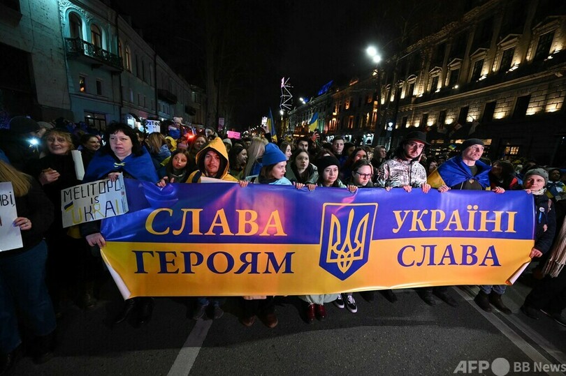 【2月25日 AFP】ジョージアの首都トビリシの議会前で、ロシアのウクライナ侵攻開始から1年となる24日、ウクライナに連帯を示し、ジョージアの欧州連合(EU)加盟を支持するデモが行われ、AFP記者の推計で約3万人が参加した。