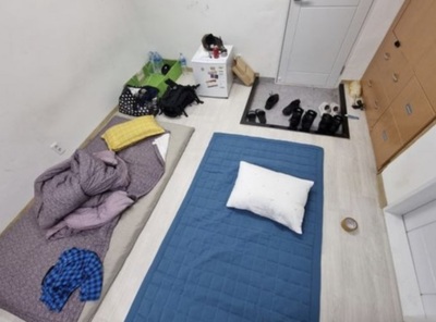 写真を見ると、部屋は非常に狭く、1人用マット2つを敷くとほぼいっぱいになる。片方の壁面に小さな作り付け棚があり、残った空間には小さな冷蔵庫が置かれている。