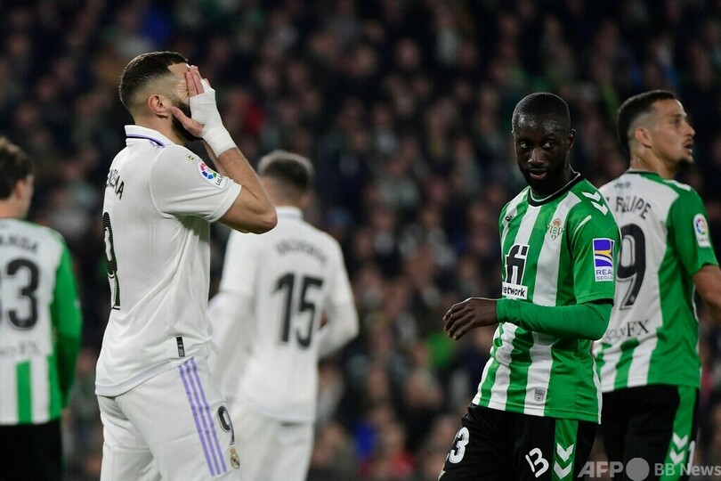レアルは多くのチャンスをつくり出したが、カリム・ベンゼマ(Karim Benzema)のFKでの得点が取り消されると、ベティスのGKクラウディオ・ブラーボ(Claudio Bravo)にベンゼマやビニシウス・ジュニオール(Vinicius Junior)のシュートも阻まれ、バルサとの勝ち点差を保つのに必要だった得点を奪えなかった。(c)AFP/Rik Sharma