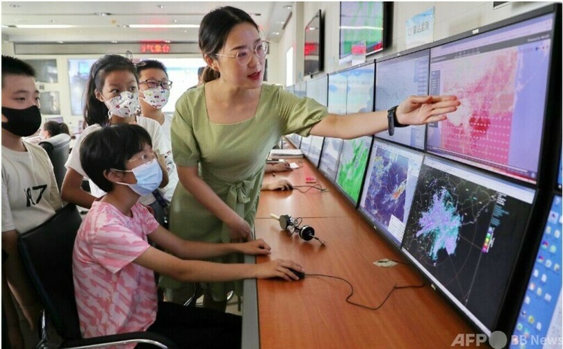 湖北省(Hubei)気象サービスセンターに入ると、中国初の総合エネルギー気象サービスプラットフォームである黄岡市(Huanggang)の電力調整スマート気象サービス決定支援システムが活躍している。気象予測を電力予測に変換し、黄岡市の新エネルギー発電量を有効に活用するための支援を行っている。(c)People’s Daily/AFPBB News