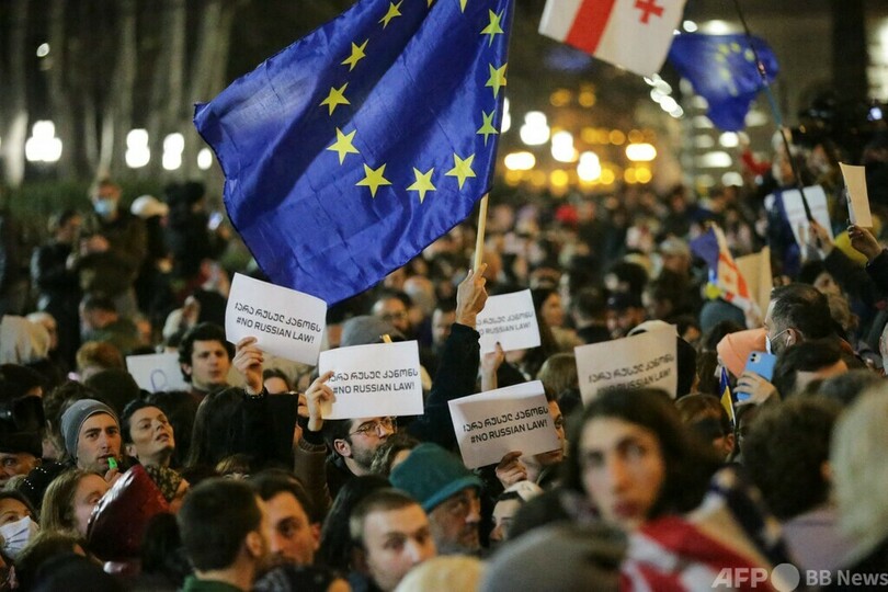 ジョージアでは今週、外国とつながりのあるメディアなどに登録義務を課す「外国のエージェント(代理人)」法案をめぐり、同様の法律がロシアで反体制派の取り締まりに利用されているとして、首都トビリシの議会の外で大規模な抗議活動が行われた。与党は9日、法案を取り下げた。