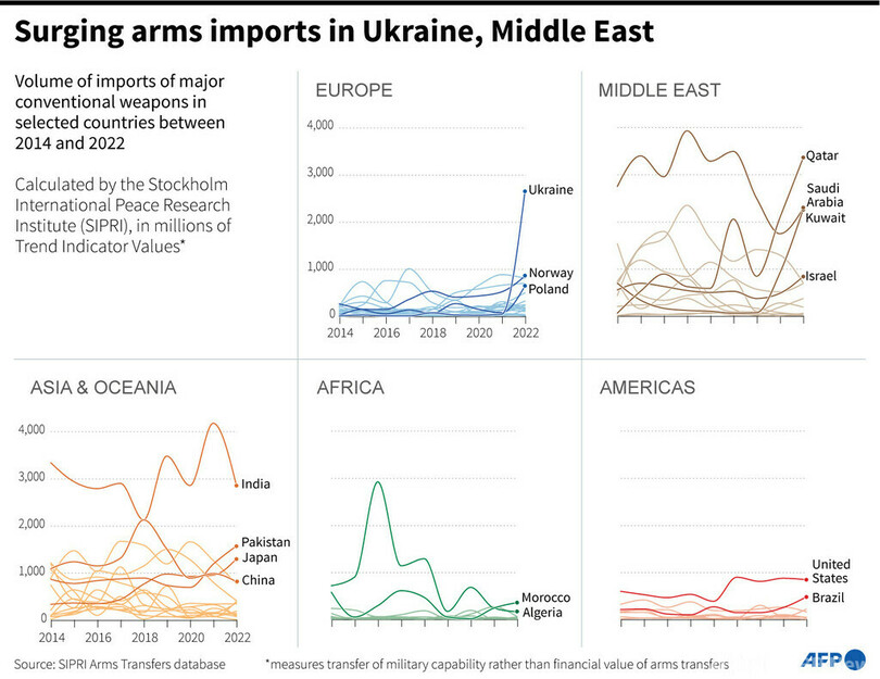 【3月13日 AFP】スウェーデンのストックホルム国際平和研究所(SIPRI)は13日に公開した報告書で、欧州の2022年の武器輸入が前年比で93%増加したとの分析を発表した。ロシアの侵攻を受けるウクライナへの武器供給が大きな要因となった。