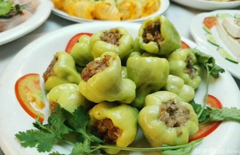 蘇さんの調理法は、もち米を鍋で炊き、刻んだ豚バラ肉、カリカリに挽いたピーナツを混ぜるか、ベーコンまたは塩漬けの魚を加えて鍋でソテーし、皮の厚い野菜の葉で包む。さらに鍋に油とニンニクのみじん切りを入れて香りが出るまで炒め、野菜の包みと水少々を加えて火が通るまで煮る。こうして醸した野菜は香ばしくてモチモチした食感が食欲をそそるという。(c)CNS/JCM/AFPBB News
