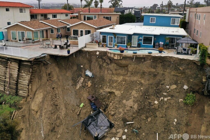 【3月16日 AFP】米カリフォルニア州サンクレメンテ(San Clemente)で15日、嵐による豪雨の影響で、集合住宅の横のがけが崩れた。