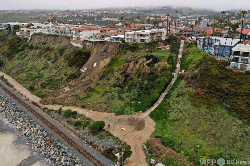【3月16日 AFP】米カリフォルニア州サンクレメンテ(San Clemente)で15日、嵐による豪雨の影響で、集合住宅の横のがけが崩れた。