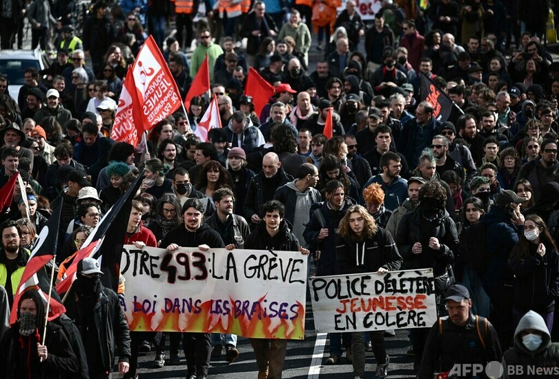【3月19日 AFP】フランス各地で18日、エマニュエル・マクロン(Emmanuel Macron)政権が受給開始年齢引き上げを柱とする年金改革法案を強行採択したのを受け、抗議デモが行われた。