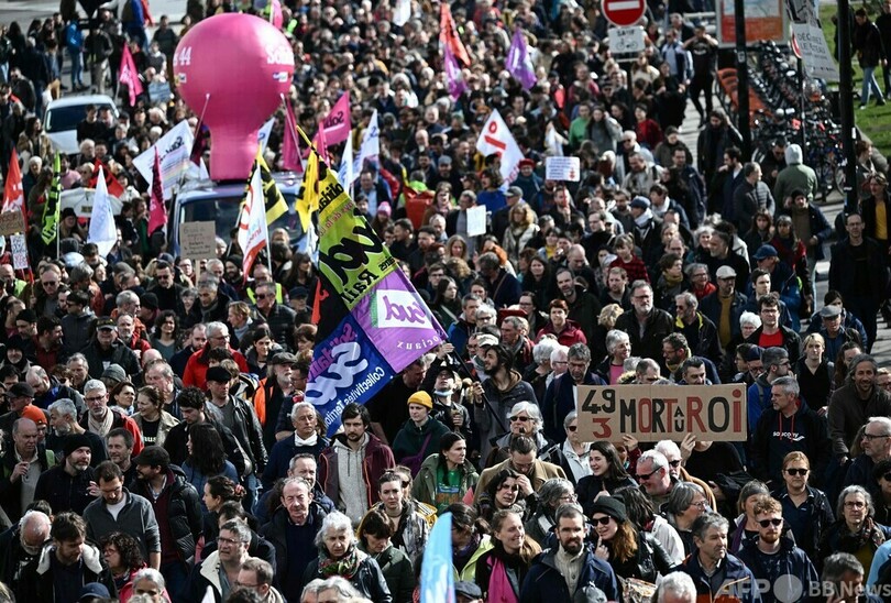 【3月19日 AFP】フランス各地で18日、エマニュエル・マクロン(Emmanuel Macron)政権が受給開始年齢引き上げを柱とする年金改革法案を強行採択したのを受け、抗議デモが行われた。