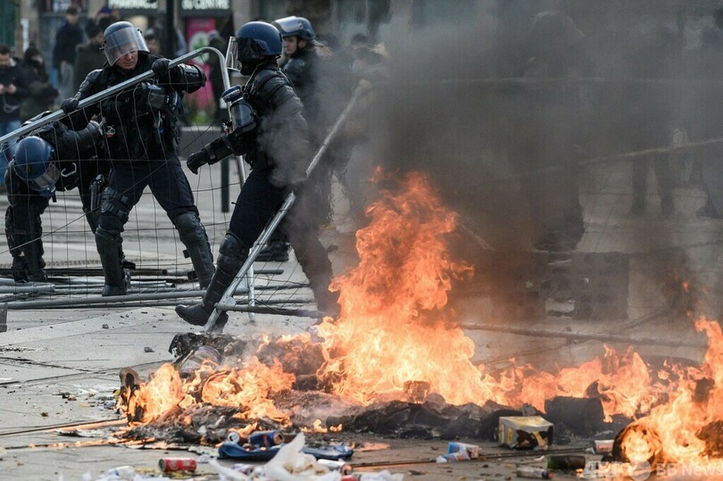 【3月19日 AFP】フランス各地で18日、エマニュエル・マクロン(Emmanuel Macron)政権が受給開始年齢引き上げを柱とする年金改革法案を強行採択したのを受け、抗議デモが行われた。