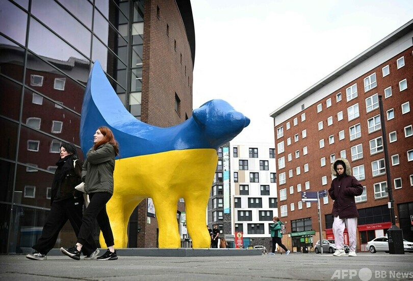【3月20日 AFP】5月に欧州国別対抗歌謡祭「ユーロビジョン・ソング・コンテスト(Eurovision Song Contest)」が開催される英イングランド北西部リバプールで、日本人美術作家の太郎千恵藏(Taro Chiezo)氏の立体作品「Superlambanana」がウクライナ国旗色に塗り替えられた。
