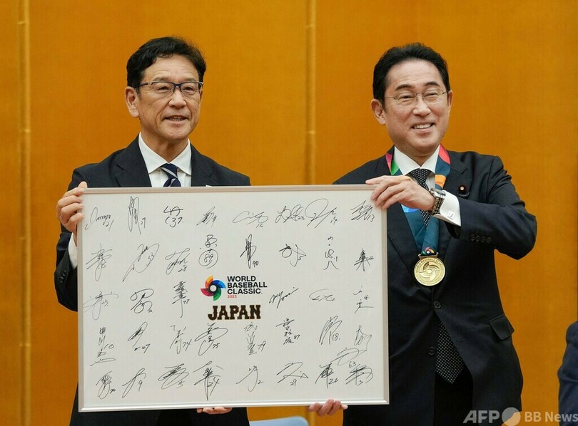 【3月24日 AFP】第5回ワールド・ベースボール・クラシック(WBC)を制した日本代表のメンバーが23日の帰国後、都内の首相官邸を訪問し、岸田文雄(Fumio Kishida)首相と面会した。