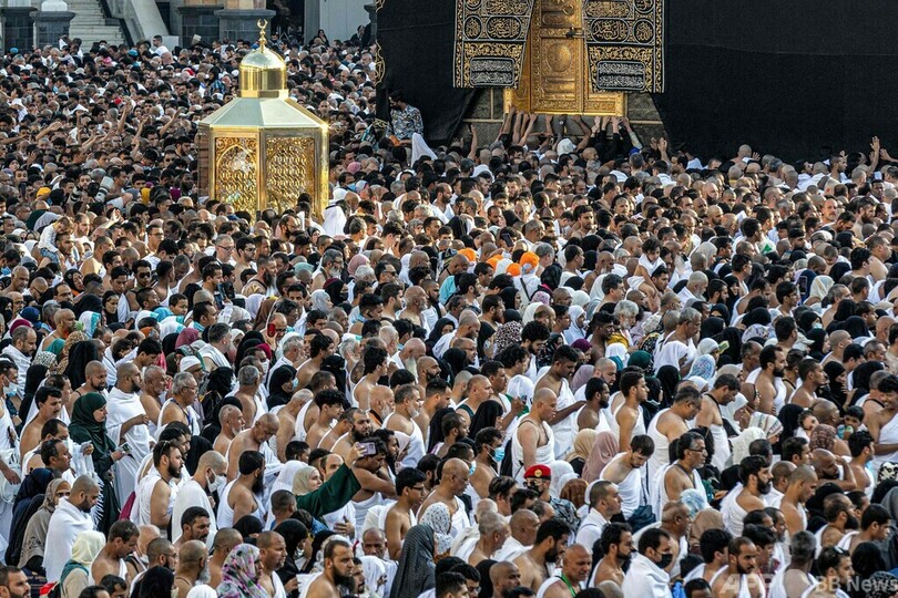 同日にはイスラム教の聖地メッカ(Mecca)の聖モスク(Grand Mosque)中心にある黒布で覆われた直方体のカーバ(Kaaba)神殿の周りを掃除する様子が見られた。