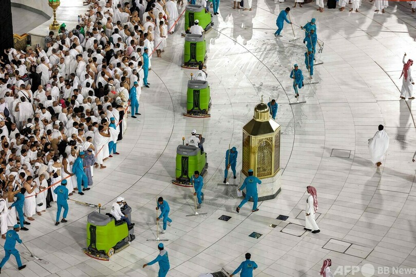 同日にはイスラム教の聖地メッカ(Mecca)の聖モスク(Grand Mosque)中心にある黒布で覆われた直方体のカーバ(Kaaba)神殿の周りを掃除する様子が見られた。