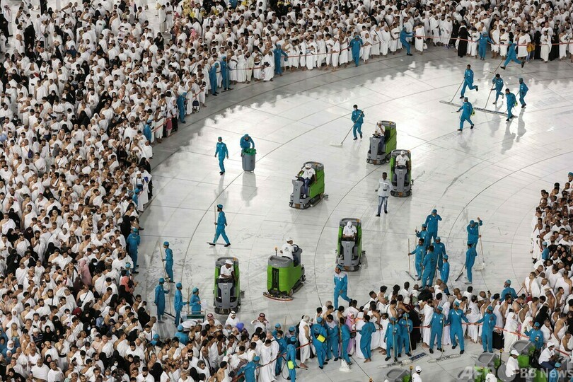 同日にはイスラム教の聖地メッカ(Mecca)の聖モスク(Grand Mosque)中心にある黒布で覆われた直方体のカーバ(Kaaba)神殿の周りを掃除する様子が見られた。