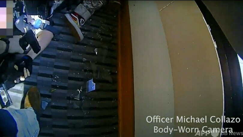米テネシー州ナッシュビルの小学校コブナント・スクールで、警察の発砲を受けて床に横たわるオードリー・ヘイル容疑者。同市警察が公開したボディーカメラ映像より(2023年3月27日撮影、同28日公開)。(c)AFP PHOTO / Metropolitan Nashville Police Department