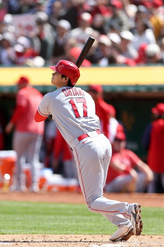 【4月3日 AFPBB News】米大リーグ(MLB)は2日、各地で試合が行われ、ロサンゼルス・エンゼルス(Los Angeles Angels)の大谷翔平(Shohei Ohtani)はオークランド・アスレチックス(Oakland Athletics)戦に3番・指名打者(DH)で先発出場し、5回に推定飛距離136メートルの今季第1号本塁打を放った。この日は4打数1安打1打点だった。