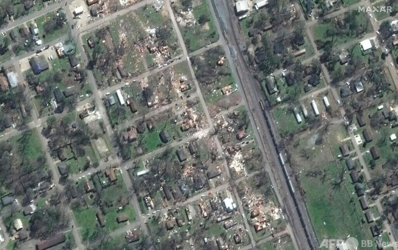 アーカンソー(Arkansas)州でも、強力な竜巻が複数発生し、少なくとも5人が死亡した。被災前後の様子を衛星写真で比較する。(c)AFP