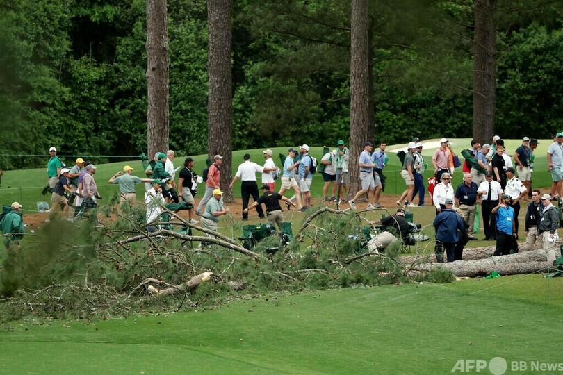 アクシデントは17番のティーグラウンド横で発生した。倒れた3本は、オーガスタ・ナショナルのトレードマークとして知られる松の木。主催者は直後にラウンドを中断し、観客をコースから退避させた。その後、結局2日目は荒天のため順延となり、39選手がホールアウトできなかった。(c)AFP