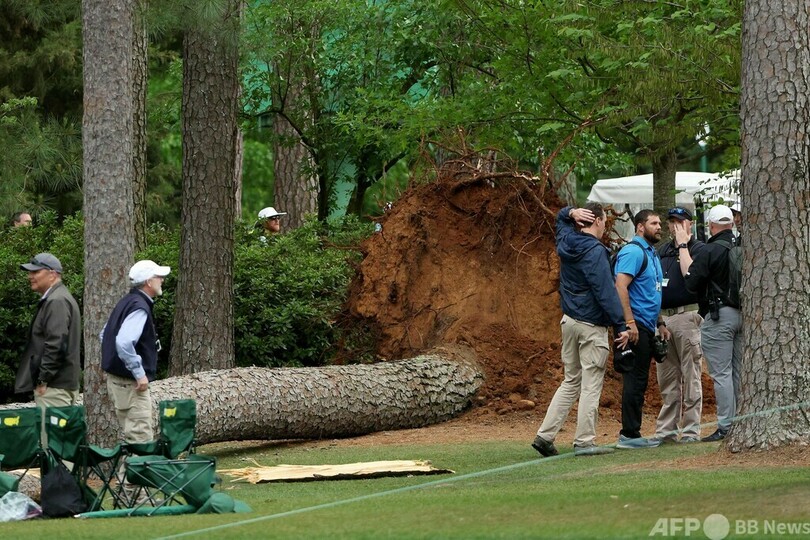 アクシデントは17番のティーグラウンド横で発生した。倒れた3本は、オーガスタ・ナショナルのトレードマークとして知られる松の木。主催者は直後にラウンドを中断し、観客をコースから退避させた。その後、結局2日目は荒天のため順延となり、39選手がホールアウトできなかった。(c)AFP