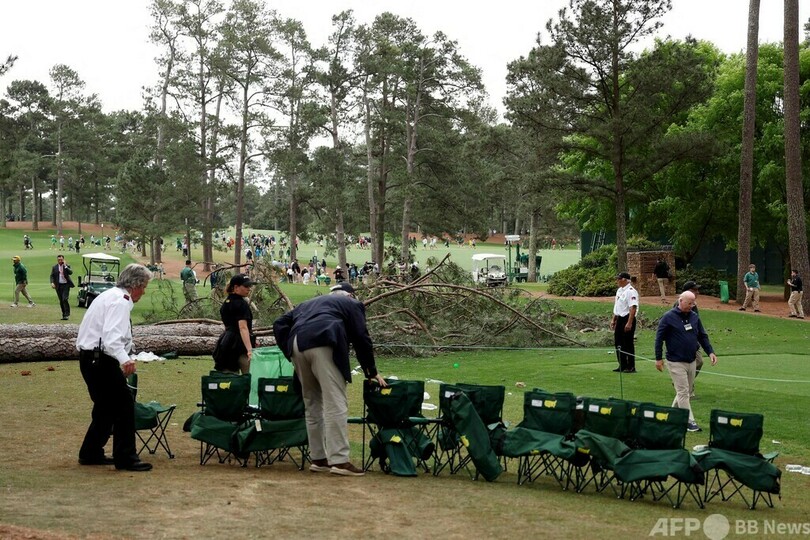 アクシデントは17番のティーグラウンド横で発生した。倒れた3本は、オーガスタ・ナショナルのトレードマークとして知られる松の木。主催者は直後にラウンドを中断し、観客をコースから退避させた。その後、結局2日目は荒天のため順延となり、39選手がホールアウトできなかった。(c)AFP
