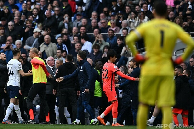 後半に入ると、タッチライン際での言い争いでブライトンのロベルト・デ・ゼルビ(Roberto De Zerbi)監督、そしてトッテナムのクリスティアン・ステッリーニ(Cristian Stellini)暫定監督が退場処分を受けたが、トッテナムは79分にハリー・ケイン(Harry Kane)が勝ち越し弾を決め、2-1で勝利した。(c)AFP