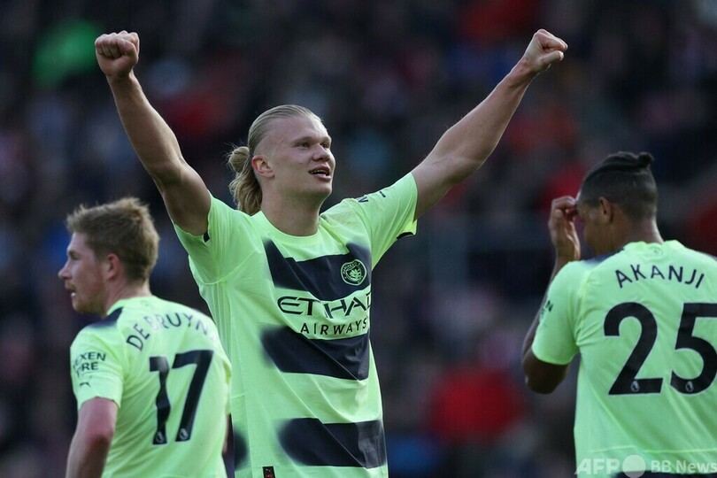 【4月9日 AFP】22-23イングランド・プレミアリーグは8日、第30節の試合が行われ、マンチェスター・シティ(Manchester City)はアーリング・ブラウト・ハーランド(Erling Braut Haaland)の2得点などでサウサンプトン(Southampton FC)を4-1で下し、首位アーセナル(Arsenal)との勝ち点差を縮めた。