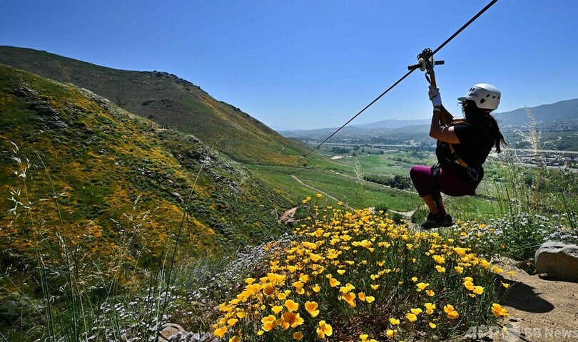 【今日の1枚】一面の花畑でジップライン 米カリフォルニア