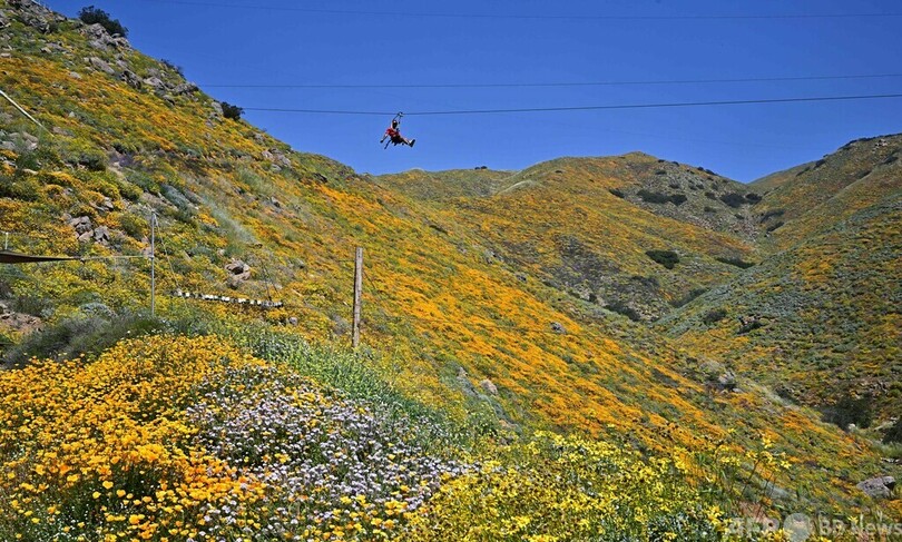 【今日の1枚】一面の花畑でジップライン 米カリフォルニア