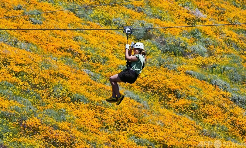 【4月22日 AFP】米カリフォルニア州コロナ(Corona)にあるアドベンチャーパーク「スカル・キャニオン・ジップライン(Skull Canyon Ziplines)」で、満開の花畑の上をジップラインで移動する女性。異例の降雨量だった冬を経て、咲き誇る花々を一目見ようと多くの人が州立公園に詰めかけている。(c)AFP