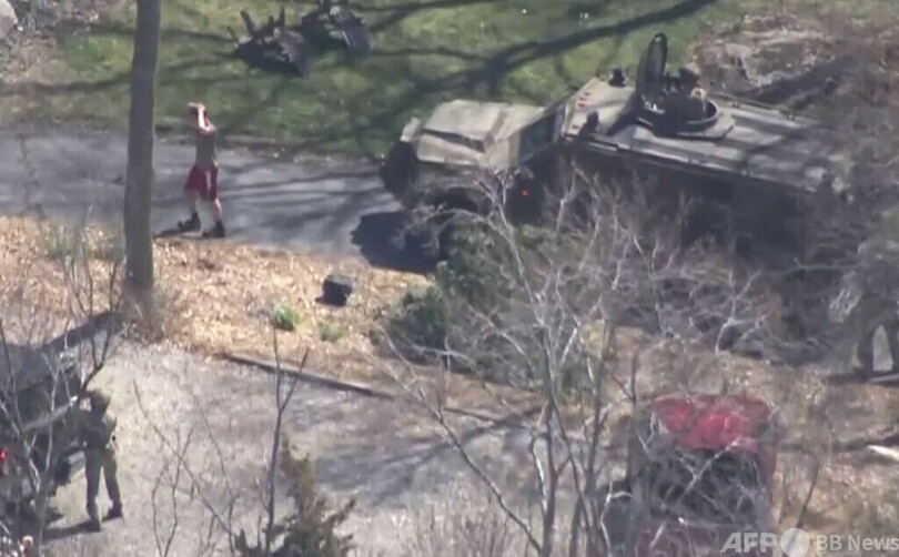 米メディアは、マサチューセッツ州ノースダイトン(North Dighton)で、赤い短パン姿の容疑者が重武装した捜査官により身柄を拘束され、車に乗せられる様子をヘリコプターから撮影した映像を放送した。(c)AFP