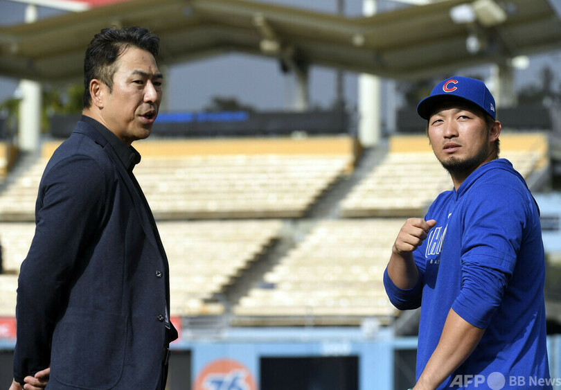試合前には広島東洋カープ(Hiroshima Toyo Carp)時代のチームメートで、元ドジャースの黒田博樹(Hiroki Kuroda)氏と談笑した。(c)AFPBB News
