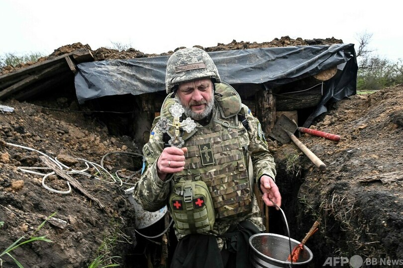 ウクライナでも、人々が復活祭の礼拝に参加した。北東部ハルキウ(Kharkiv)の前線では前日、塹壕(ごう)を清める従軍聖職者の姿が見られた。(c)AFP