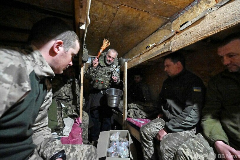 ウクライナでも、人々が復活祭の礼拝に参加した。北東部ハルキウ(Kharkiv)の前線では前日、塹壕(ごう)を清める従軍聖職者の姿が見られた。(c)AFP