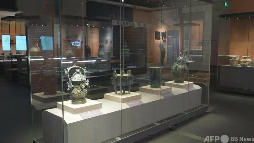 展示される一部の所蔵品には、湖北省と湖南省で出土した新石器時期(肖家屋根文化)の玉器があります。造形が美しく、種類が豊富で、製造技術が優れており、中国の初期の玉文化を代表するものです。長江中流における先史期の陶文化にも特色があり、石家河遺跡で出土した多くの陶製の像が生き生きとした形をし、目を見張るものがあります。さらに貴重なのは、それらの像の1点から4000年前の人類の指紋が発見されたことです。今回初めて展示されるものには、湖北省随州市棗樹林の曽国墓地で出土した方壷、鼎、甬鐘、鎛鐘などがあります。これらの鐘からなる編鐘(音高の異なる複数の鐘を枠につるした、古代中国の打楽器)は近年、湖北省で出土した最も重要な音楽文化財であり、鐘に刻まれた銘文は曽国の歴史を研究する上で重要な意義があります。また、越王勾践の子孫が使用したとみられる青銅の戈や、長江流域で最大規模の殷王朝(紀元前1600年ごろ~紀元前1046年)の城跡である盤龍城遺跡から出土した精巧な青銅器なども展示されています。(c)CGTN Japanese/AFPBB News