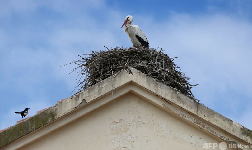 【4月25日 AFP】スペイン・マドリードから35キロ離れたアルガンダ・デル・レイ(Arganda Del Rey)で、屋根に作られた巣に立つコウノトリと左横のカササギ。気候温暖化の影響により、多くのコウノトリがアフリカを目指す渡りの中継地点でしかなかったスペインに留まるようになった。(c)AFP