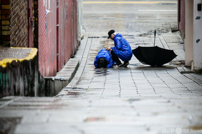 【5月7日 AFP】韓国ソウルの梨泰院(Itaewon)の路地で泣き崩れるチョ・ミウンさん(左)と、傍らで慰める夫のイ・ジョンチュルさん。夫妻は昨年10月のハロウィーンに起こった雑踏事故で24歳の息子イ・ジハンさんを失った。
