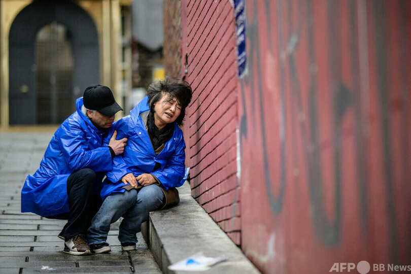 【5月7日 AFP】韓国ソウルの梨泰院(Itaewon)の路地で泣き崩れるチョ・ミウンさん(左)と、傍らで慰める夫のイ・ジョンチュルさん。夫妻は昨年10月のハロウィーンに起こった雑踏事故で24歳の息子イ・ジハンさんを失った。