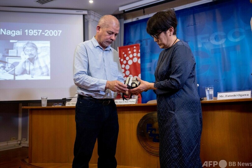 タイの首都バンコクにあるタイ外国特派員協会(FCCT)でこの日、ミャンマーの独立系放送局「ビルマ民主の声(DVB)」が、長井さんの妹、小川典子(Noriko Ogawa)さんにカメラを手渡した。カメラには、長井さんが最後に撮影した映像が残っていた。
